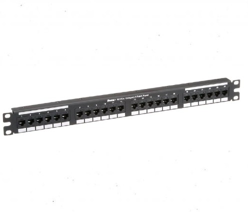 The NetKey Flat Punch down Keystone Patch Panel terminates 4-pair, 22–26 AWG, 100-ohm twisted pair cable. These Cat 6 patch panels mount to 19″ and 23″ racks and incudes 24 ports. The RJ45 interface provides a quick plug and play connection to RJ45 patch cords. This punch down patch panel is 1 RU, made of steel and is black.